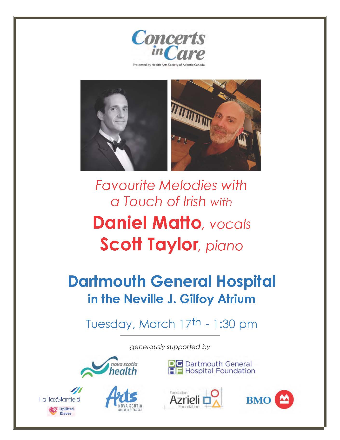 Concerts in Care returns to Dartmouth General Hospital for a 1:30 performance in the atrium on March 17th, featuring some Irish tunes perfect for St. Patrick’s Day. The scheduled performers are the experienced duo of vocalist Daniel Matto and pianist Scott Taylor.
